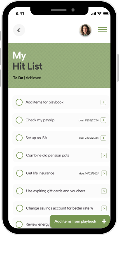Your hit list in which you can add the playbook’s suggested to-do items or create your own. You can set your own deadlines and reminders, and tick them off when done.
